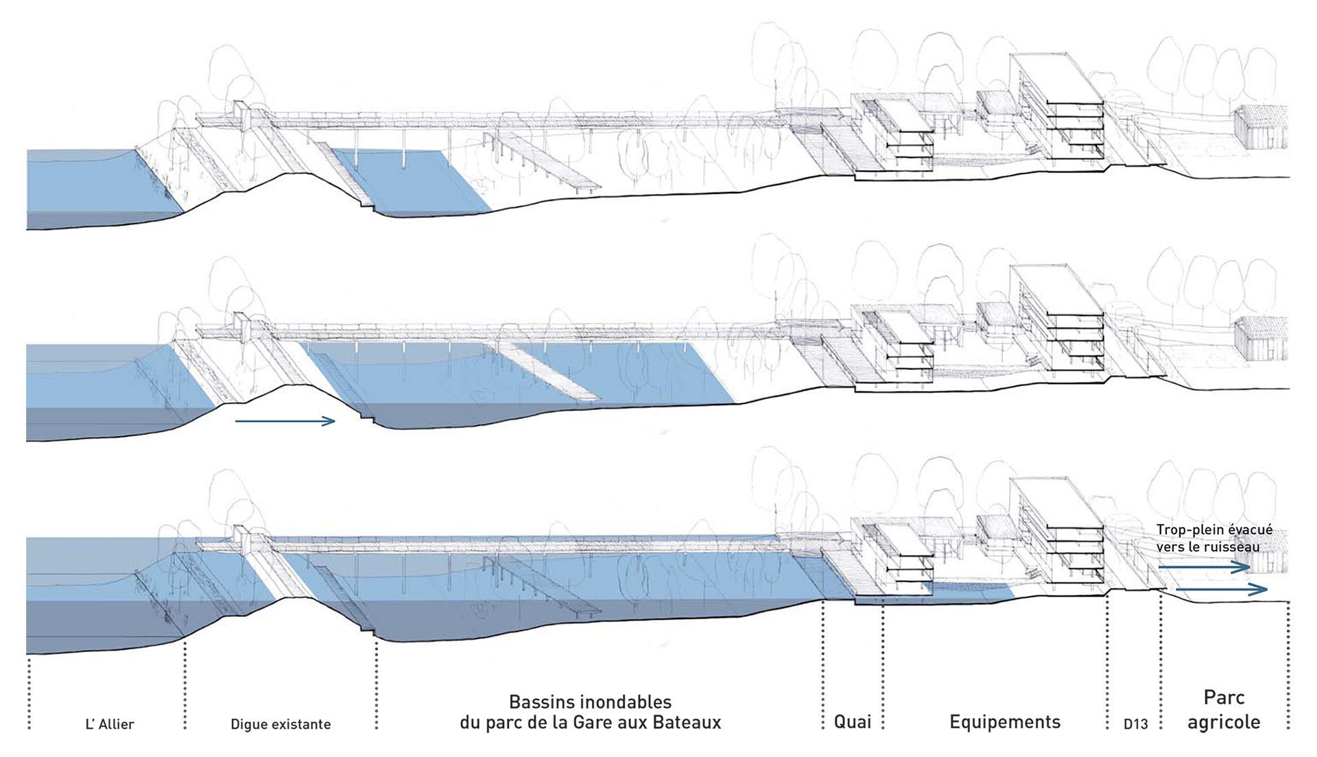 L’ensemble du parc de la Gare aux Bateaux et du parc agricole forme un système de gestion des crues, permettant une inondabilité progressive et contrôlée, afin d’équilibrer le niveau de l’Allier. Dans un premier temps l’eau monte les différents paliers du parc de la Gare aux Bateaux, le transformant en bassin.