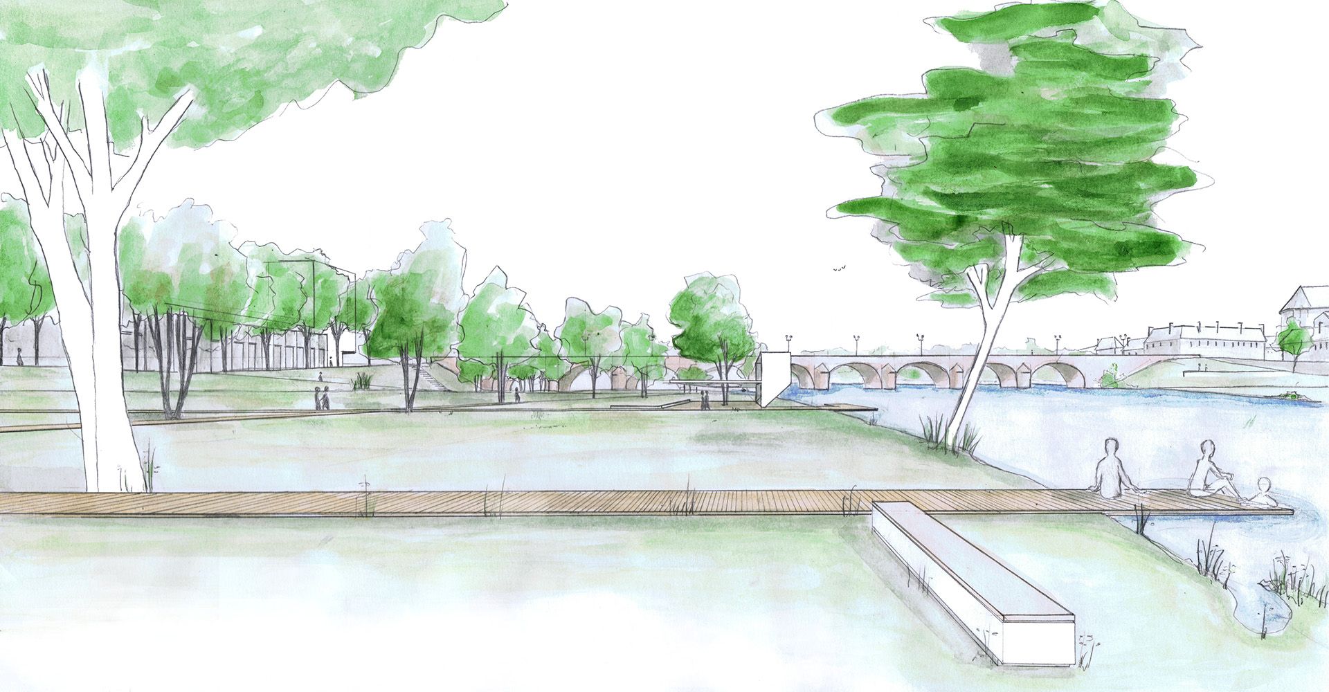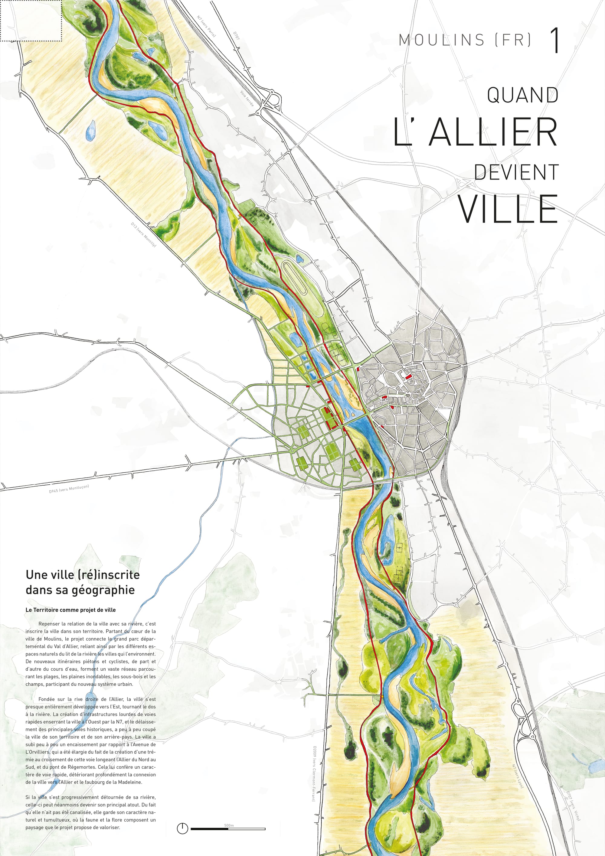 L'équipe considère la ville de Moulins comme un point d’inflexion dans le parc départemental de la vallée de l’Allier. L’épaisseur du lit majeur dessine un espace ouvert de contemplation à mettre en scène en développant des points de vue et belvédères, des pontons et espaces de déambulation, des émergences architecturales répondant aux flèches des édifices religieux de la rive droite. Sur le plan urbain, le projet s’appuie sur un réseau de cheminements et une trame d’espaces publics interconnectés entre les deux rives. En continuité du nouveau pont se développe un nouveau boulevard délimitant le faubourg de la Madeleine. La création de plusieurs parcs submersibles en vis-à-vis a pour but de maximiser l’accessibilité aux berges et de développer les usages au contact de l’eau. Le site de la Murière fait l’objet d’une densification progressive par ses limites en continuité du tissu existant. Le projet privilégie des formes urbaines plus denses sur la rive gauche.