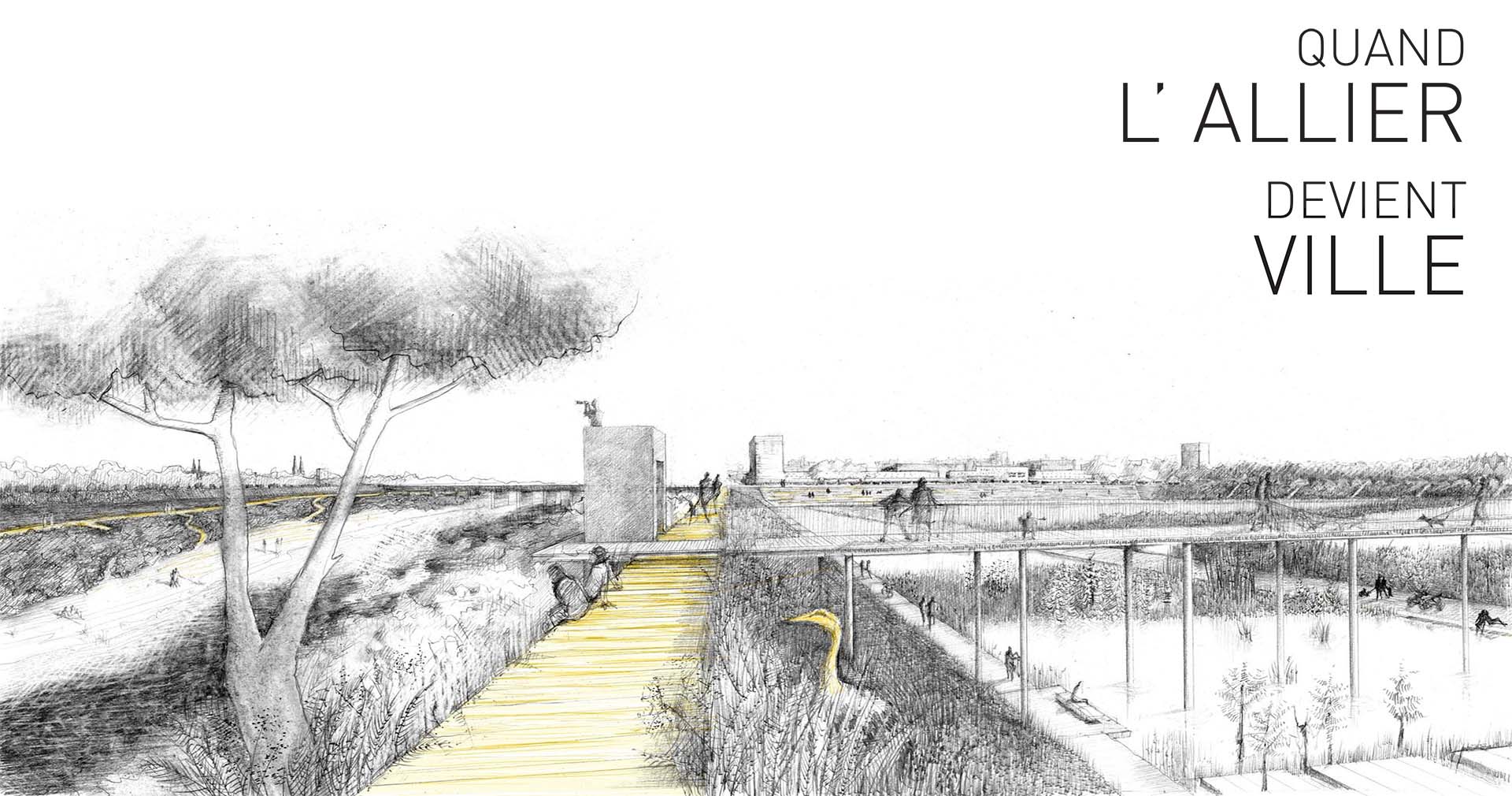 Au débouché du centre-ville, le panorama s’ouvre sur le grand territoire. L’Allier devient un espace de contemplation de la ville. Nous proposons d’aménager, des deux côtés de la rivière, un système de plateformes et de points de vue : L’Allier devient un lieu où deux morceaux de ville se regardent. Quelques émergences marquent les têtes de pont et font écho aux tours du centre-ville.