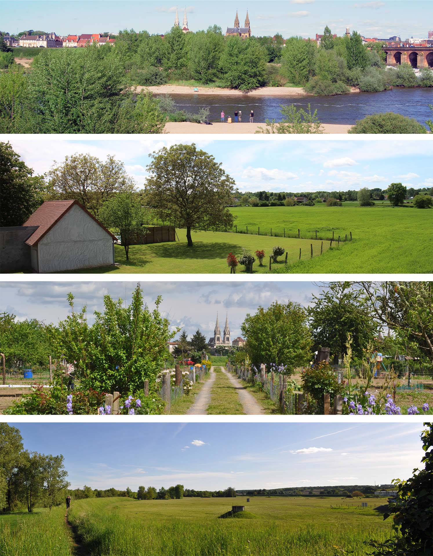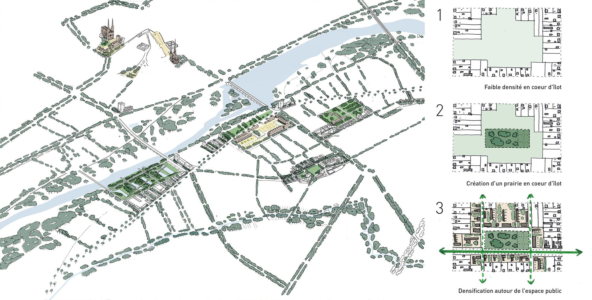Inclus dans un nouveau maillage de voies cette nouvelle forme urbaine prolonge le parc de l’Allier au cœur du faubourg de la madeleine pour créer une ville jardin. Partie intégrante du système de gestion des crues, le paysage du faubourg évolue en fonction des intempéries. Les prairies, légèrement encaissées par rapport aux voies se transforment en bassins de rétention, avant de libérer leurs eaux par un maillage de noues le long d’axes paysagers en direction de la rivière. La surélévation des rez-de-chaussée au-dessus de parkings semi-enterrés, intègre le même système de retenue d’eau et de transformation du paysage.